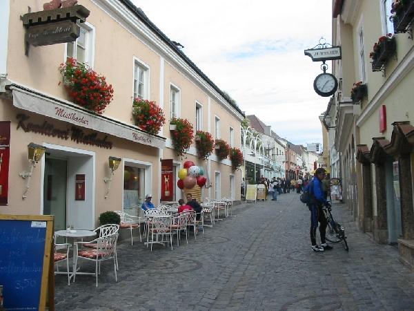 Melk (45 km). Po krátkej obedňajšej prestávke sme prešli na ľavú stranu Dunaja. V obciach sa predávalo miestne víno i burčiak (Sturm). Pred Kremsom pribúdalo miestnych cyklistov ochutnávajúcich burčiak, víno a chuťovky k tomu (