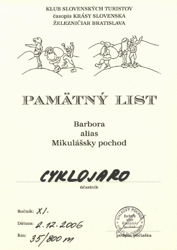 KST) Železničiar Bratislava zorganizoval 11. ročník diaľkového turistického pochodu Barbora alias Mikulášsky pochod. Prezentácia účastníkov bola medzi 8.00 a 9.00 pod Hlavnou železničnou stanicou na Žabotovej ulici. Plánovaná dĺžka tohto pochodu bola 35 km s prevýšením 800 m cez Kamzík, Biely Kríž, Marianku, Kačín na Železnú studničku. Po modrej turistickej značke sme prišli na