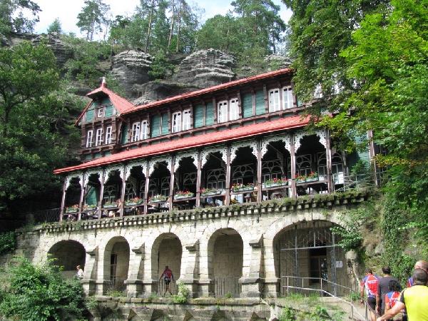Cyklovýlety v Českom Švajčiarsku a návšteva galérie v Drážďanoch, 1.8. – 8.8.2009 Bajtlich Chříbska Dĺžka trasy: 250 km Motto: “Příběh tohoto území se počíná před mnoha miliony lety, kdy se v oblasti dnešního Českého Švýcarska rozprostíralo mělké moře. Právě z jeho písečného dna se po ústupu moře zrodil podivuhodný svět pískovce. Svět skalních věží, mostů a bran, svět roztodivných kamenných forem, které připomínají včelí plástve anebo přesýpací hodiny.” Z web stránky Příroda Českého Švýcarska Mapa Zväčšiť mapu Výkonný výbor Cykloklubu APOLLO pod vedením predsedu Ladislava Zvadu usporiadal v dňoch 1.8. - 8.8.2009 cyklovýlety v Českom a v Saskom Švajčiarsku. Podujatia sa zúčastnilo 40 cyklistov, ktorí boli ubytovani v rekreačnom stredisku Bajtlich nedaleko obce Chřibská, necelých 30 km od mesta Děčín. Najaktívnejší cyklisti prešli v kopcovitom teréne vyše 350 km. Názov obce Chřibská vytvoril Palacký podľa kopcovitého rázu okolitej krajiny (chřib = pahorok). Nejstaršia zmienka o obci je z roku 1383, kedy získala prvé privilegia od Michaloviců, mestom je od roku 1570. Vysídlením pôvodného obyvateľstva ostalo v oblasti veľa voľných domov, ktoré boli bezplatne venované rôznym skupinám imigrantov. Ukázalo sa, že čo je zadarmo si nikto neváži, a mnohé domy boli v minulosti zdevastované - historik Ján Mlynárik Ubytovanie v chatkách rekreačnej oblasti Bajtlich bolo pre niektorých z nás cestovaním v čase. Veď málokto má dnes možnosť zopakovať si časy pionierskych táborov a atmosféru jedálne s nenapodobiteľnou vôňou a chuťou čaju. Tento obraz dotváralo aj sústredenie detí – Karate klubu z mesta Česká Lípa. Miestami to vyzeralo, ako by sa zastavil čas. Problémom bolo dostať sa k vlastným peniazom, nakoľko bankomaty sa tu masovo neujali, sú - podobne ako zmenárne, len vo veľkých mestách (najblišší bol v meste Česká Kamenice). Česká gastronómia na ktorú sme sa vopred veľmi tešili - nesklamala - ale ceny v horských strediskách boli často dvojnásobné ako napríklad v Slovanskom dome v Dečíne. I knedle boli väčšinou také, ako u nás doma. Často boli účtované zvlášť, ako príloha ktorú sme si neobjednali. Cítili sme sa nie celkom vítaní ani v podnikoch označených logom „Cyklisté vítání“, kde nám nedovolili k pivu konzumovať ani malé pagáčiky od Zitky. Najlepšie jedlá sme ochutnali, a gastrodojmy sme si napravili v reštaurácii Kyjovská terasa, kde bola profesionálna obsluha, atraktívne rodinné prostredie s dobrým feng šuej, zaujímavým jedálnym lístkom a s pozornosťou podniku na záver stolovania. Pivo sa tu čapuje väčšinou tradičným spôsobom - čo istý čas trvá - a v našej lokalite boli najviac čapované značky Zlatopramen, Březňák, Konrad, Svijatel, Staropramen, Granát, Prazdroj, Budvar. Najviac nám chutilo pivo Březňák na Koupališti a tmavé 11 st. pivo Zlatopramen. Na pivo Bernard sme nenatrafili. Cena za 0,5 l piva bola 15 – 35 českých korún (1 € = 25 Kč), v niektorých podnikoch bolo pivo podchladené. Rozprávkovo krásny hornatý kraj však bohato prevážil drobné nedostatky, za ktoré organizátori však vôbec nemohli. Chladné noci podporovali výdatný a osviežujúci spánok. Počasie, okrem pondelka, bolo slnečné, v horách celkom príjemne znesiteľné. Mnohé cesty v národnom parku sú len pre peších, cyklistom je tam vstup zakázaný pod hrozbou pokuty 2000 Kč. Nedeľňajšia etapa na najviac vyhľadávaný turistický cieľ Pravčická brána merala 55 km, časť trasy sme bicykel tlačili a priemerna rýchlosť bola 15,4 km/hod. K Pravčickej bráne sme šľapali peši, bicykle sme si nechali strážiť našimi spolucyklistami, čo sa ukázalo ako prezieravé, keďže na tomto mieste dvaja cyklisti neskôr (v stredu) o svoje bicykle prišli. Pravčická brána je najväčším pieskovcovým skalným mostom (bránou) v Európe, má dĺžku 26 m a výšku 16 m. Súčasťou Pravčickej brány je výletný zámoček Sokolie hniezdo (Sokolí hnízdo). Bol vybudovaný v roku 1881 na mieste chatrče (výčepu) z dubovej kôry. Štýlová fotogenická reštaurácia na prízemí je zdobená pôvodnými maľbami. Vstupné do areálu bolo 3 € (75 Kč). Pondeľňajší daždivý deň sme využili na návštevu zariadení Hotel Zámeček Ranartice a Penzion „Na konci světa“, kde nás boli ochotní obslúžiť i mimo otváracích hodín; a Koupalište, kde práve kempovali holandskí turisti na veteránoch Citroenoch. Prešli sme v daždivom počasí 25 km. V utorok sa vyčasilo, a tak sme sa vydali do Nemecka k údoliu rieky Labe do oblasti Saské Švýcarsko. Prešli sme 85 km priemernou rýchlosťou 17 km/hod. V Saskom Švajčiarsku sme navštívili obec Hinterhermsdorf, pokračovali sme údolím potoka do kúpeľného mestečka Bad Schandau. Po spoločnej fotografii na námestí sme obdivovali malebné údolia a skaly z pravého brehu rieky Labe. Cez opustený hraničný prechod sme sa dostali do mestečka Hřensko, v ktorom bolo množstvo Vietnamcov predávajúcich rôzne tovary a gýče. To sme už boli len 4 km od Pravčickej brány. V utorok večer bola opekačka a posedenie pri táborovom ohni s tromi spevákmi a hráčmi na gitaru (Sašo, Jozef a miestny gitarista). V stredu sme autobusom navštívili Děčín (cesta trvala necelú hodinu) a vlakom popri ľavom brehu rieky Labe mesto Drážďany (rýchlikom trvala cesta 40 minút). Cieľom bola galéria v Drážďanoch, ktorá za vstupné 10 € ponúka množstvo zážitkov, na ktoré by bolo potrebné rezervovať si oveľa viacej času - Staatliche Kuntsammlungen Dresden. Cestou sme sa príjemne občerstvili v reštaurácii Slovanský dům v Dečíne. Vo štvrtok sme absolvovali kombinovaný cyklo-turistický výlet a prešli sme Pavlino údolí v dĺžke etapy cc