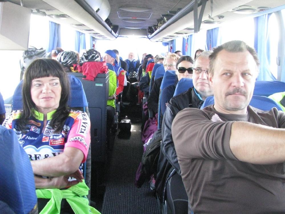 Nezvyčajne studené októbrové ráno 0°C, pocitovo podľa weather.com -1°C. Obliekanie cibuľové po vrstvách, zimná vetrovka, neprefúkavé nohavice pre motorkárov a šál cez tvár istia prechod k autobusu. Tachometer vypovedá poslušnosť, predné svetlo bliká, hoci je v inom režime. Autobus Mercedes. Dvere zatvorené. Nakladanie bicyklov sa začalo potme o 6:00 hod. Trasieme sa od zimy. Spopod mosta vychádza studené slnko. Dobre padne presso na ÖMV. Prosba otvoriť autobus sa u šoféra nestretla s pochopením. Sú vraj zlé skúsenosti. Niektorí od zimy behajú pod mostom, iní sa k sebe túlia v aute, vyťahujú deky, vyzeráme ako bezdomovci. O 8:30 hod. vyrážame, o 11:00 hod. hladko pristávame s jednou prestávkou v Melku. Strihaním pások vyslobodzujeme bicykle z tesného objatia čerstvo prerobeného cykloprívesu.