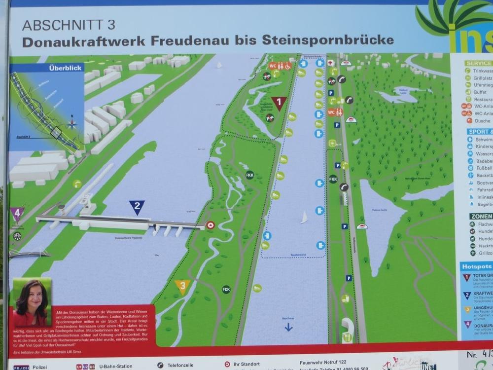 |  Prechádzame ponad umelý kanál naľavo od hlavného toku, nazývaný "Neue Donau". |  Sme na ostrove "Donauinsel" - vybudovaný bol v rokoch 1972-1988, pôvodný zámer bola regulácia toku Dunaja. |  Mapa časti Donauinsel (1) s vodnou elektrárňou Freudenau (2). Výsadba zelene na ostrove bola v rokoch 1992-1998. |  Kraftwerk Freudenau - elektráreň Freudenau, postavená v rokoch 1992-1998. |  Kraftwerk Freudenau - mohutné plavebné komory vodného diela. |  Opustili sme Donauinsel a sme späť na ľavom brehu Dunaja. |  Bufet "U Toniho" je vyhľadávaným miestom. |  Ceny roku 2014 - rebierka s pečenými zemiakmi za 15,90 €. |  U Toniho nám vždy chutilo. |  U Toniho sú chutné a dostatočne veľké porcie. |  Dve Evky a Silvia. |  Lacko Zvada a Janka. |  Janka a Gabika. |  Spokojný Martin S. |  Editka. |  Janko D. |  Gabika a Editka. |  Najedení odchádzame od Toniho. |  Pokračujeme po ľavom brehu Dunaja proti prúdu. |  Vpredu Alenka. |  Ideme po nábreží, vľavo kanál Nový Dunaj (Neue Donau) a za ním Donauinsel. |  Vpredu Martin. |  Ivan a Silvia. |  Nové zábavné centrum Viedne nazývané Copa Cagrana (Neue Danube Party Place Wien). |  Prechádzame cez most na Donauinsel. |  Za nami zábavné centrum a pláž Copa Cagrana, vzadu budovy Donau City. |